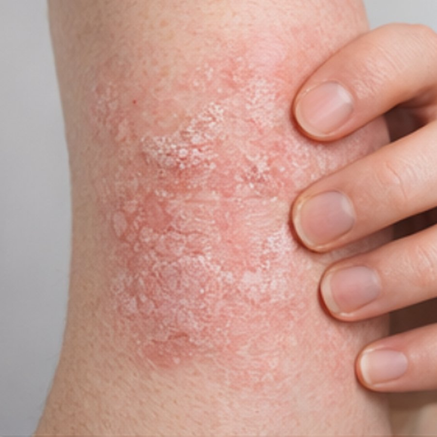 Enfermedad inflamatoria crónica que se manifiesta con placas rojas y escamas blancas, comúnmente en codos, rodillas y piel cabelluda. No es contagiosa, puede asociarse a artritis psoriásica y a otras enfermedades metabólicas.